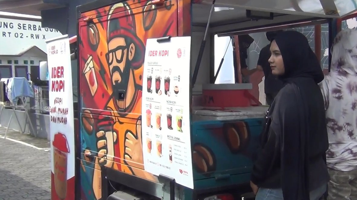 “Alhamdulillah Ider Kopi ikut menyemarakkan acara ini. Mungkin ini pertama kalinya ada lomba mural yang juga melibatkan kami. Salah satunya tuk-tuk di belakang ini, armada penjualan kami yang ikut digambar para muralis. Konsep penjualan kami adalah coffee-to-go, menggunakan gerobak listrik dan tuk-tuk,” jelasnya.
