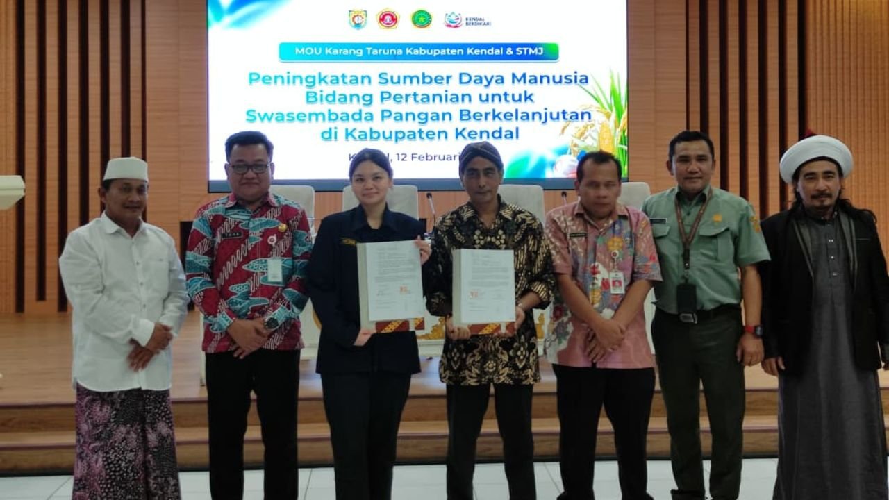 KENDAL, obyektif.tv – Upaya mewujudkan swasembada pangan berkelanjutan di Kabupaten Kendal terus diperkuat. Karang Taruna Kabupaten Kendal bersama Santri Tani Milenial Jayabinangon (STMJ) menandatangani nota kesepahaman (MoU) tentang peningkatan sumber daya manusia di bidang pertanian, Kamis (12/2/2026), di Gedung Abdi Praja Setda Kendal.