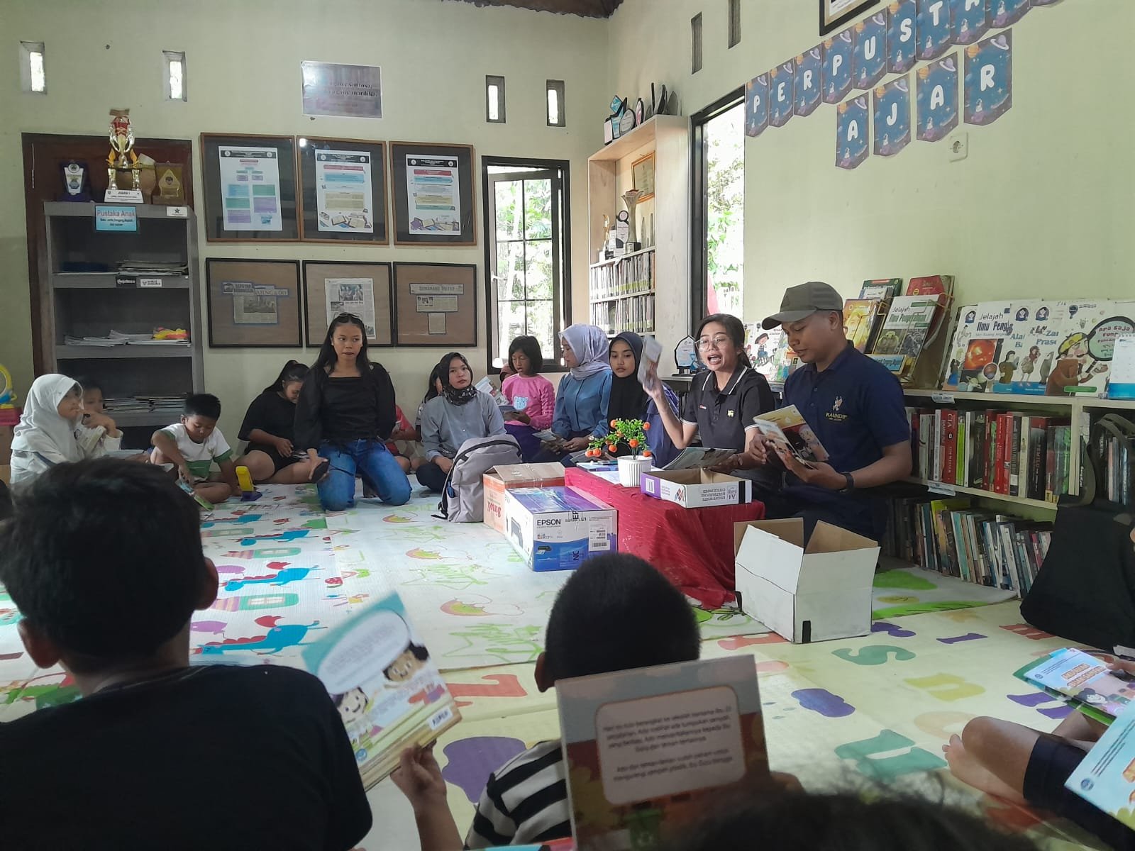 Buku dibacakan oleh Putri Ayu Arumsari dan Kelvin Galuh Dwi Adrianto (Komunitas Jateng Resik). Setelah membacakan cerita, Kak Ayu bergantian dengan Kak Kelvin bertanya pada peserta yang rata-rata siswa sekolah dasar (SD).