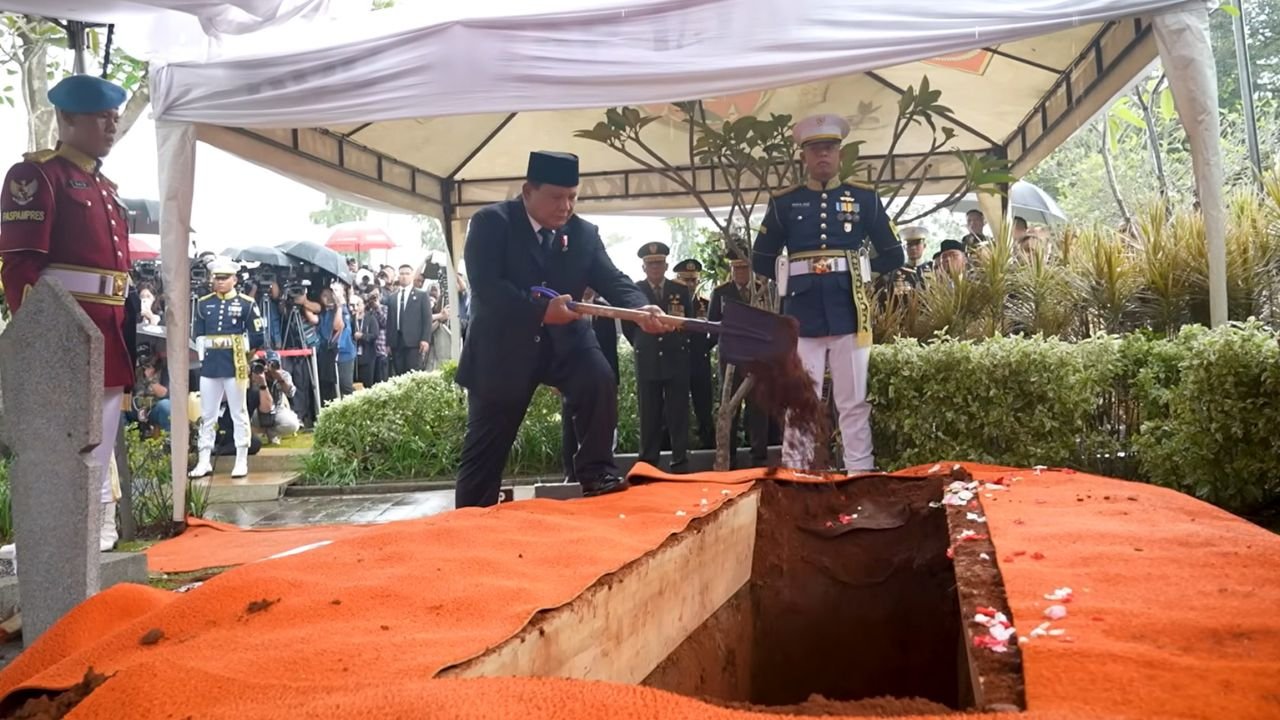 Setibanya di lokasi, peti jenazah yang diselimuti bendera Merah Putih diangkat oleh prajurit TNI menuju tempat peristirahatan terakhir. Presiden Prabowo berjalan mengiringi dari belakang peti jenazah.