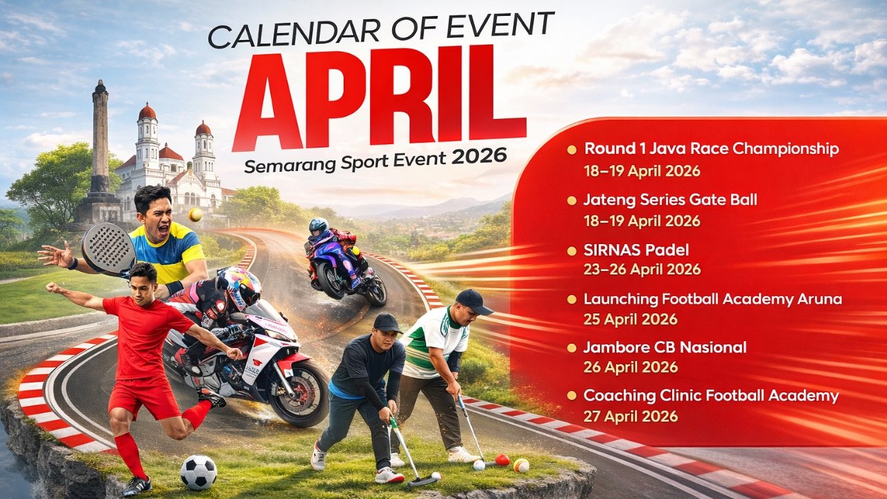 Sejumlah agenda olahraga yang digelar sepanjang April 2026 antara lain Seri I Java Race pada 18–19 April di Sirkuit Mijen, Jateng Series Gate Ball di Lapangan Tri Lomba Juang pada tanggal yang sama, serta Sirkuit Nasional (Sirnas) Padel pada 23–26 April di sejumlah venue padel.